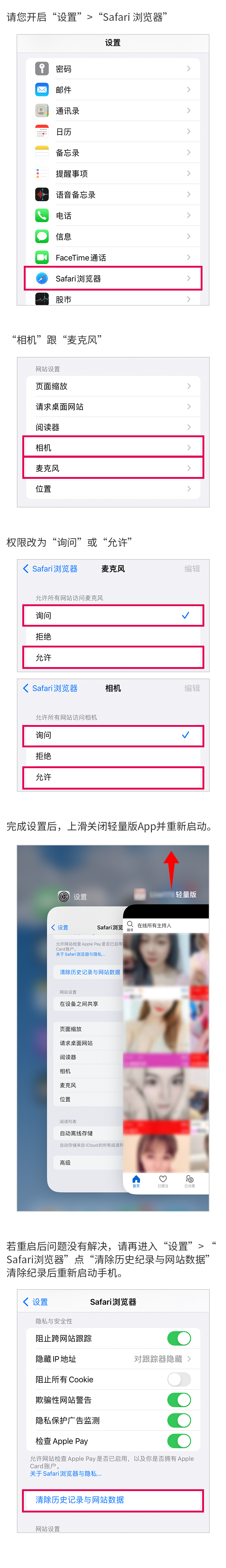 步骤一"设置"> "Safari浏览器"内找到"相机"与"麦克风"